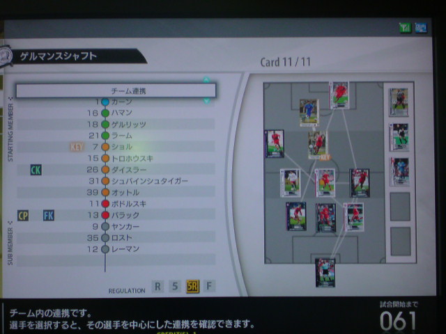 無謀にも手持ちのカードのみでドイツ縛りチームを立ち上げました。 立ち上げ当初は、CBにレーマンとロストを使っていましたが、前半途中でスタミナが空っぽになったので、チーム内で一番DF値14あるハマンをCBで起用し、3バックにしました。 立ち上げ当初は負けと引き分け多かったんですが、試合をこなすに連れて連勝するようになり、レギュラーリーグD2では6勝1敗という快進撃を見せ優勝!D1昇格後も第5節終了で3勝0敗2分けで現在1位をキープ。 そしてプレシーズンカップ優勝という結果を出した。 また、優勝は逃したものの、W4タイトルホルダーズカップとキングスクラブカップは決勝までコマを進め、どちらも1点差で敗退という結果を出した。 35試合消化した戦績は22勝9敗4分けと意外にも大変優秀。 使える選手がポドルスキとシュバインシュタイガーのコンビで、35試合消化して薄線すら付いていない2人だが、シュバインシュタイガーからのクロスにポドルスキが合わせてレッテというパターンが主な得点パターンである。 シュバインシュタイガーのサイドの突破力もそこそこあり、クロスの精度も良く、チームスタイルをダイレクトパスワークにするとサイドに展開されたボールを胸でトラップし、そのままダイレクトでクロスを上げるプレーもこなす。 DF面では抜かれたらどうしようもない。 特に厄介なのは1トップのトッティのような選手である。あっさりとDFを抜き去り、キーパーと1対1になりCPUが相手なら飛び出しのタイミングさえ間違えなければキャッチできる。対人戦では中央突破されたらカーンをキープレイヤーにしてカーンだのみ。サイド突破されたら上手くクロスボールをキャッチできるように飛び出させるくらいしかできない。 失点のほとんどはサイドからのクロスを合わせられるパターンなるため、完全にプレーヤーの腕次第である。 獲得タイトル