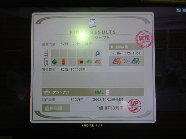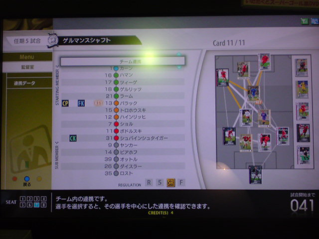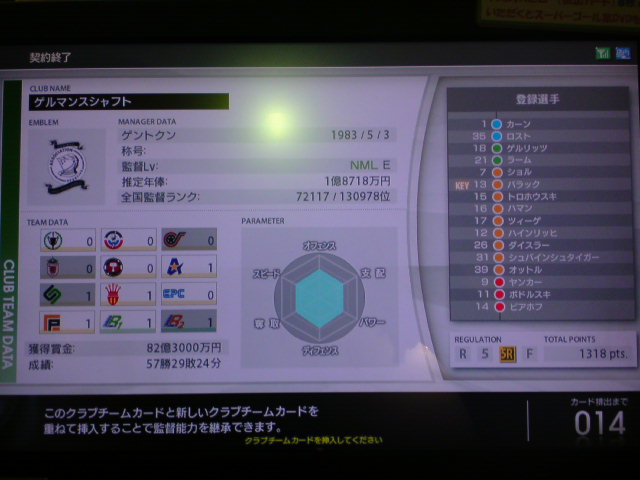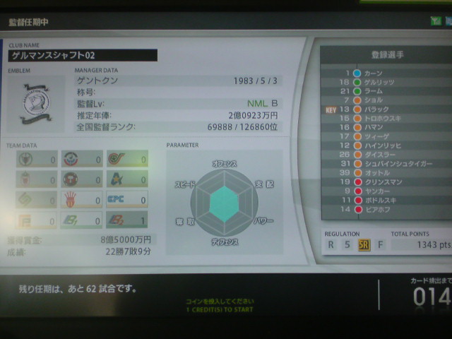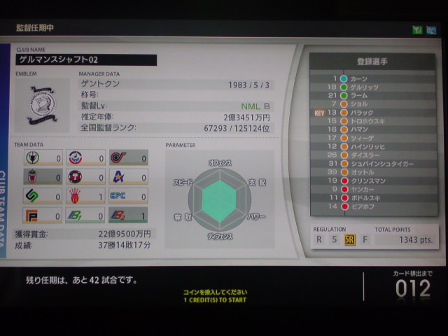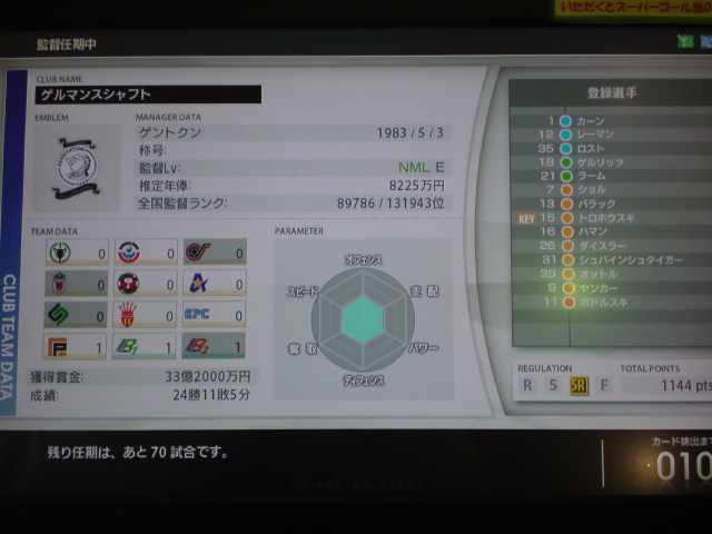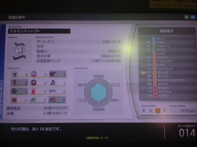 DFが2人という無謀にも挑んだドイツ縛り。途中選手補強も行ったが成績57勝29敗24分けというぼちぼちの結果で任期が終了した。獲得タイトルは6つ。獲得賞金額82億3000万。レギュラーリーグ通算成績23勝6敗10分け。黄金連携4本。チーム内得点王ポドルスキ公式戦60何試合かで65得点(くらいだったきがする)。 師弟関係には気が付いたら勝手にキャプテンになってたバラック個人5特殊4。 任期を終えての感想は、やはり一番きついのはディフェンス。最初はハマンを真ん中にした3バック、後半ツィーゲとハインリッヒを交互にLCBに使ってみましたが、アンリやトッティ、ロナウド、Cロナウド、メッシ、サビオラ、ベッカム、ビージャ、F・トーレスなどスペイン・アルゼンチン・ブラジル縛りの対人戦や一人で出来る子達がFWにいるチームは正直きつかったですね。 負け試合のほんどが、先制点はとるものの、その後2点とられて逆転負けというパターンでした。 特にアルゼンチン縛り、メッシはズルすぎ。勝てる気がしません。 さらにスペイン縛り、F・トーレスいい加減にしてください。 もっと手加減してよ。こっちは勝つの大変なんだから。 獲得タイトル
