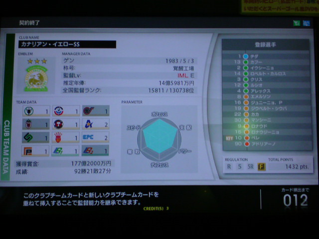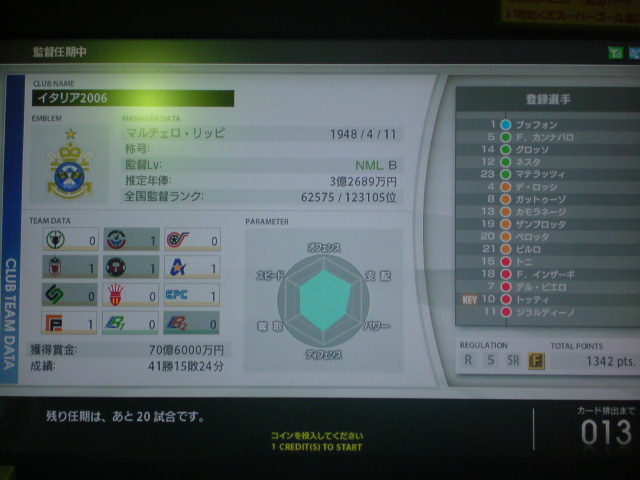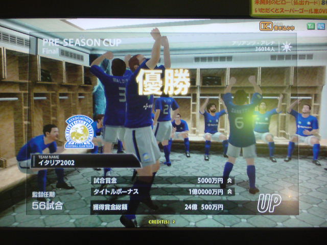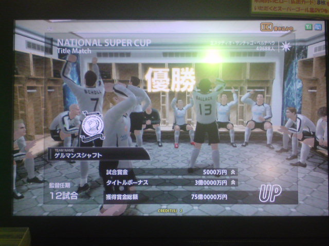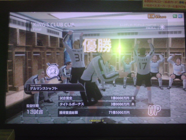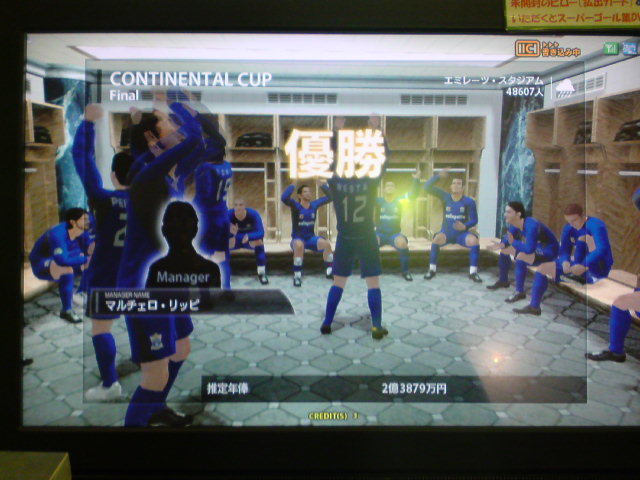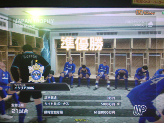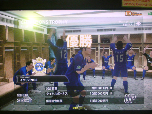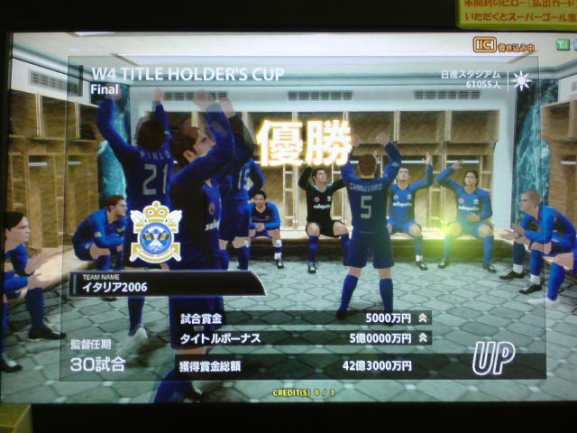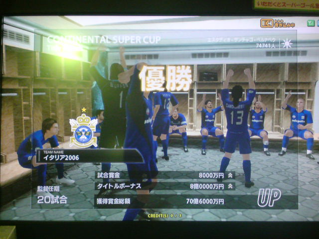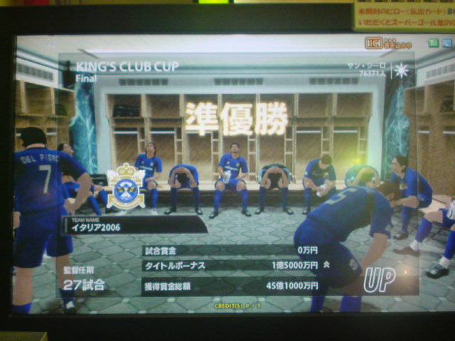 イタリア2006、W4タイトルホルダーズカップ、チャンピオンズトロフィー、コンチネンタルスーパーカップ優勝!キングスクラブカップ、ジャパントロフィー決勝敗退。コンチネンタルスーパーカップ対人戦:Shukyu2days戦、知り合いの方でこの日は3回も決勝戦で戦いました。決勝は先制ゴールを許すも、取られたら取り返すの繰り返しで、試合は2-2でドロー。PK戦の末、うちのブッフォンが3人止めて優勝を手にした。 ちなみに途中から滅多に見ない彼女連れのブラジル人っぽい人が蹴りにきたんだけど、点を取れる度にというか、点差をつけられると台バンする人でしたw。後ろから見ててかなり受けました。彼女の方はしばらく見ててその後彼氏と蹴ってたんですが、彼女の方も点取られると叫んでましたね。 獲得タイトル