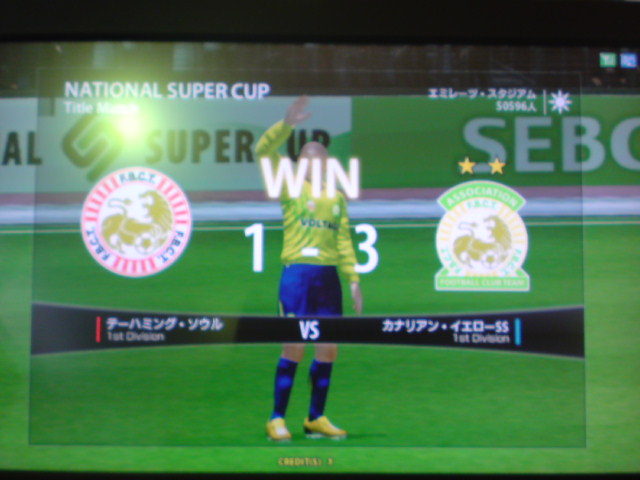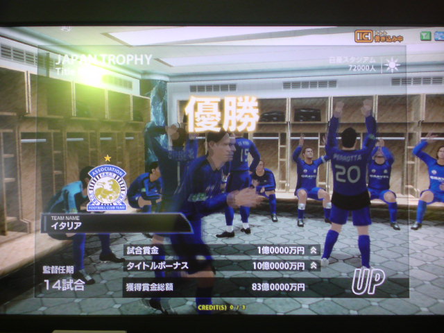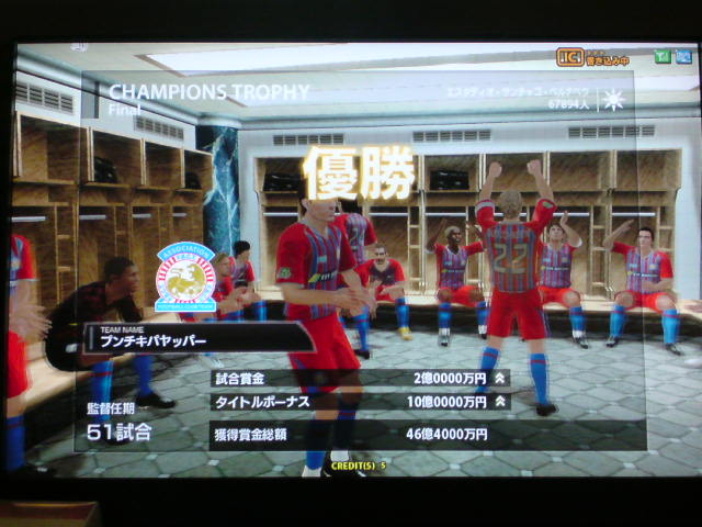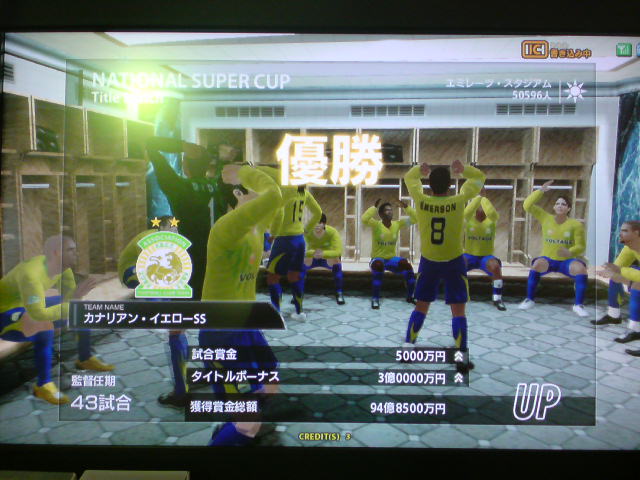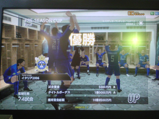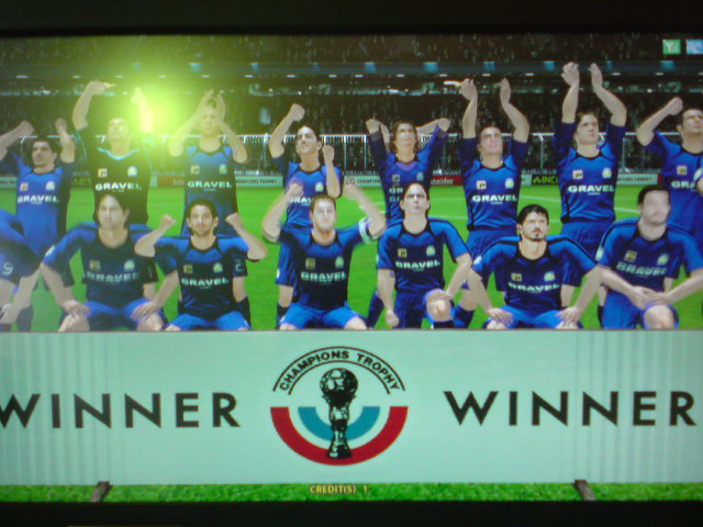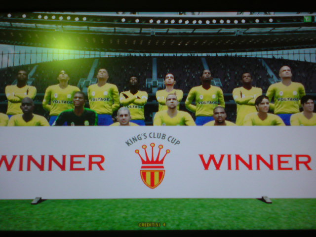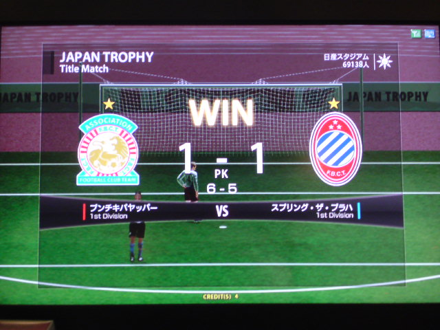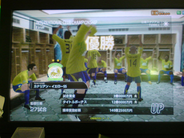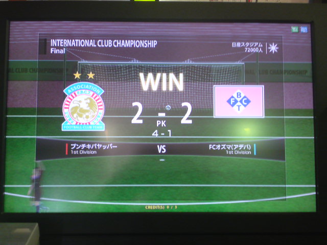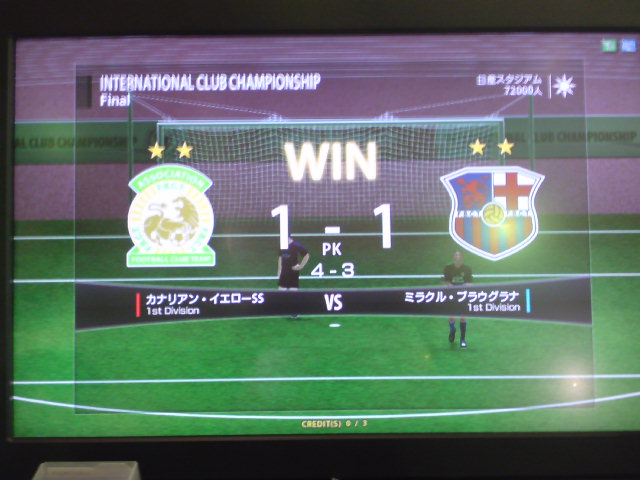 インターナショナルクラブチャンピオンシップ決勝戦、対人戦 FCオズマ(アデバ)戦。前半に先制され、後半に追いつきさらに逆転したが後半終了間際に同点に追いつかれそのまま試合終了。PK戦へ。なんとかPK戦を制し優勝した。 最近はPKになりそうな試合のときはGKをキープレイヤーにすることが多い。たとえPK系のスキルやスタイルでなくても、キープレイヤーにしておくことでPKでのセーブ率が若干上がる気がする。実際、ブラジル縛りのカナリアン・イエローSSのチームでは04-05の黒ジダを使用しているが、今までPKで負けたのが2回しかない。 獲得タイトル