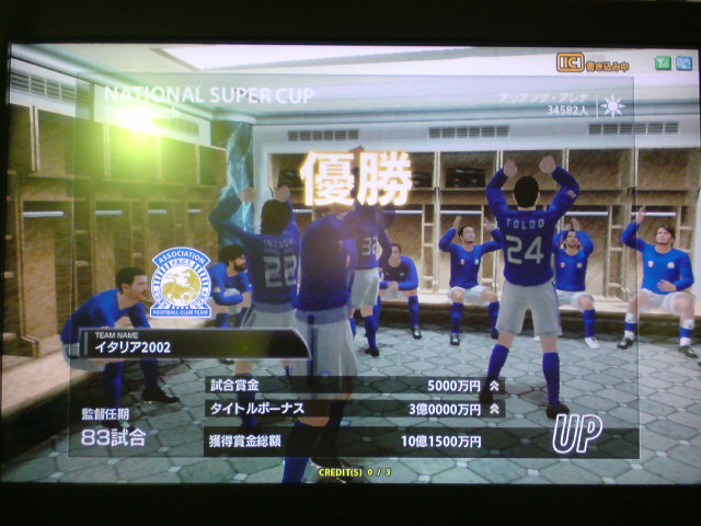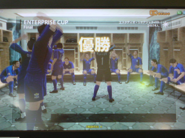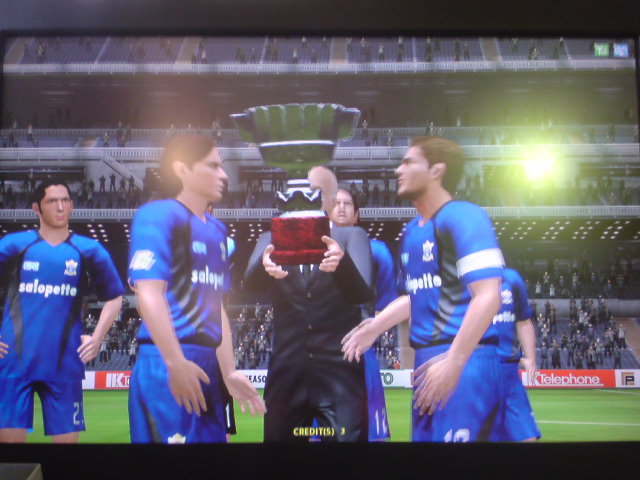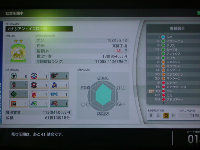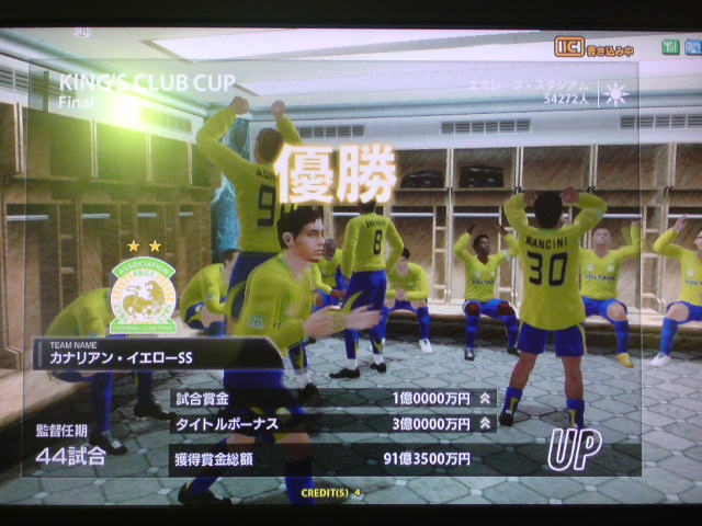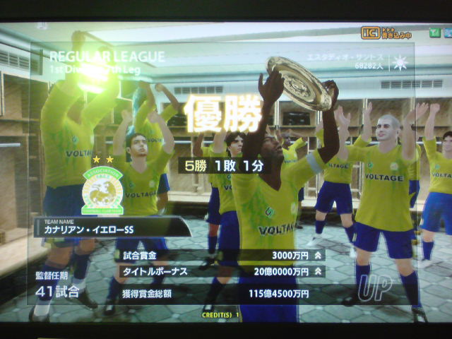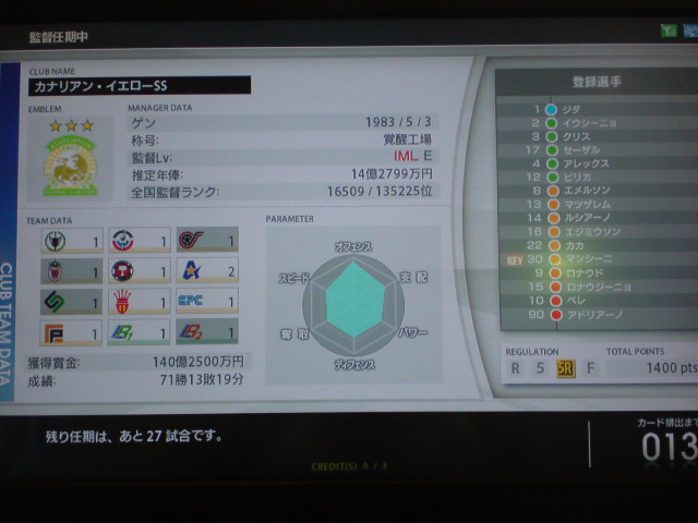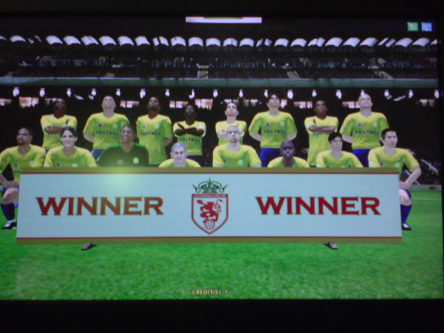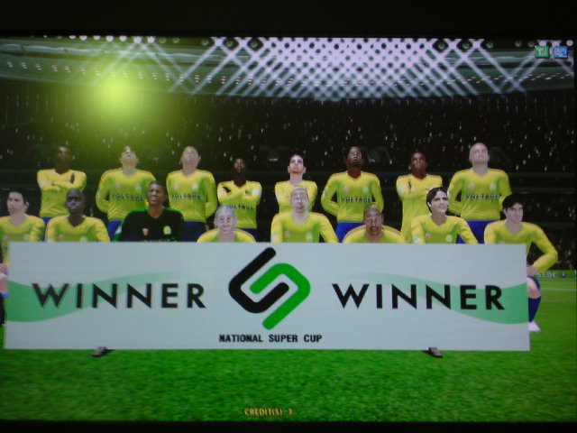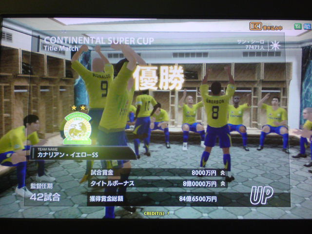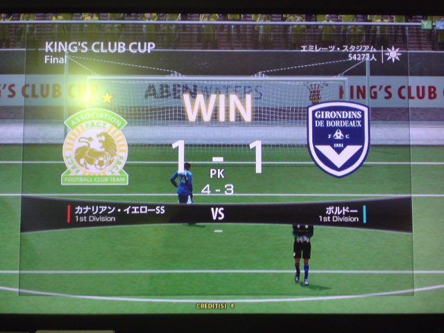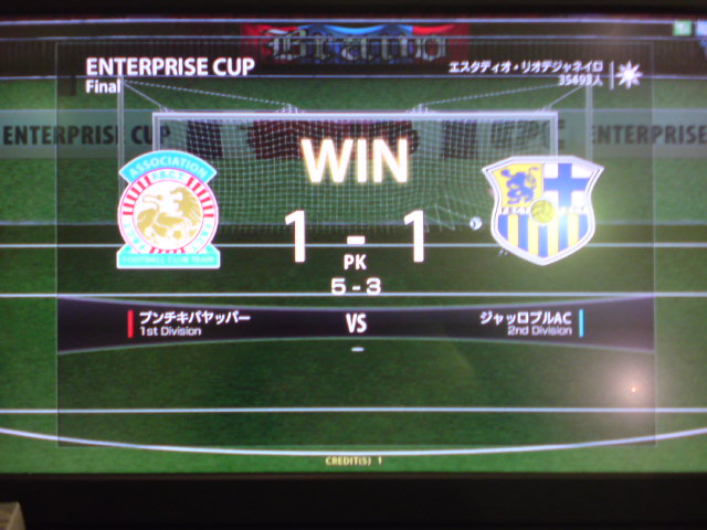 インターナショナルクラブチャンピオンシップ決勝戦、対人戦 FCオズマ(アデバ)戦。前半に先制され、後半に追いつきさらに逆転したが後半終了間際に同点に追いつかれそのまま試合終了。PK戦へ。なんとかPK戦を制し優勝した。 最近はPKになりそうな試合のときはGKをキープレイヤーにすることが多い。たとえPK系のスキルやスタイルでなくても、キープレイヤーにしておくことでPKでのセーブ率が若干上がる気がする。実際、ブラジル縛りのカナリアン・イエローSSのチームでは04-05の黒ジダを使用しているが、今までPKで負けたのが2回しかない。 獲得タイトル