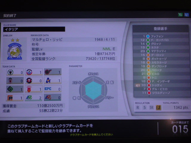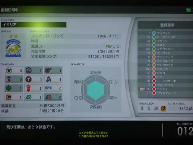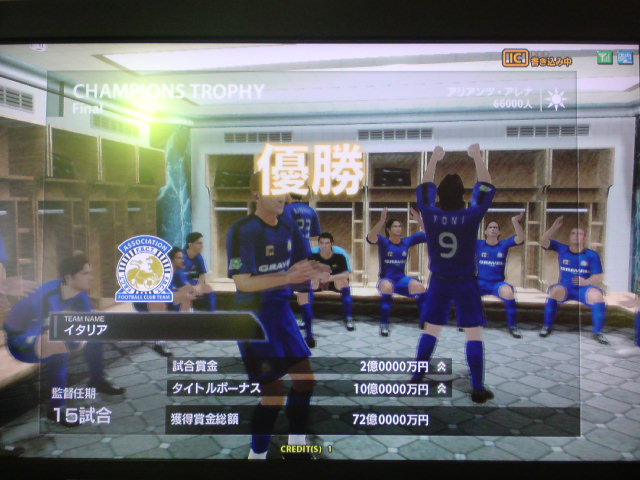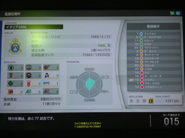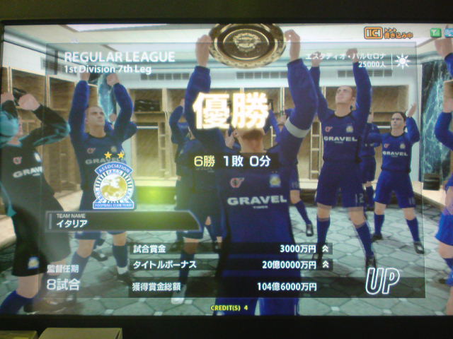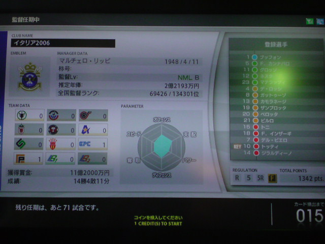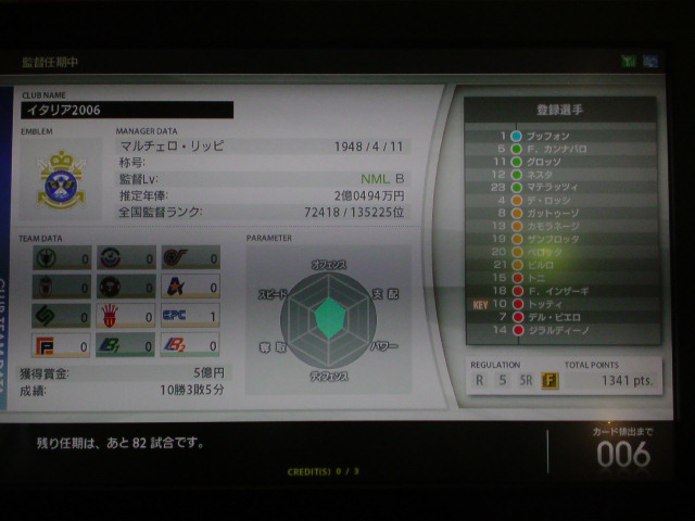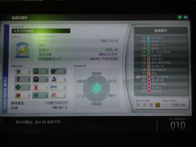 前チーム「イタリア」の引継ぎチーム「イタリア2006」。立ち上げ時は1勝3敗4分けと最悪のスタートだったが、本日、10試合ほど消化したところ9勝1分け、トータル10勝3敗5分けまで成績を立て直した。 エンタープライスカップ決勝対人戦を2-1で制してなんとかタイトル獲得した。 獲得タイトル