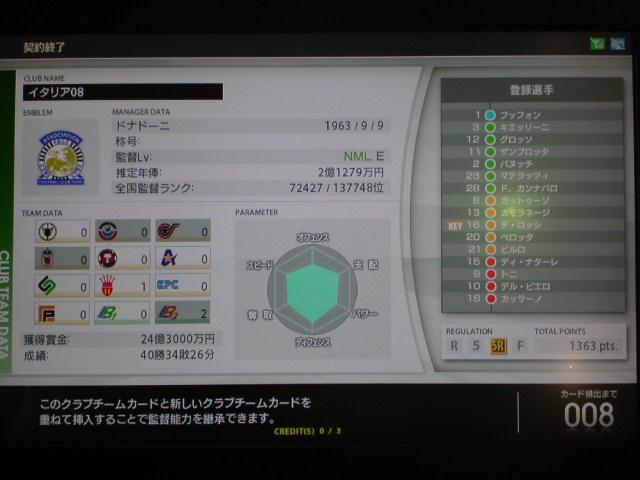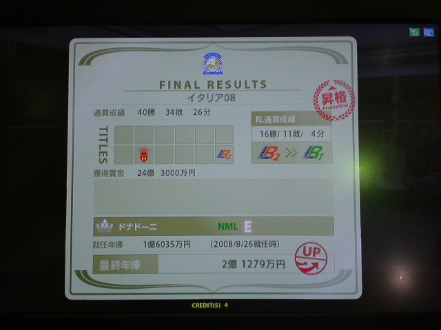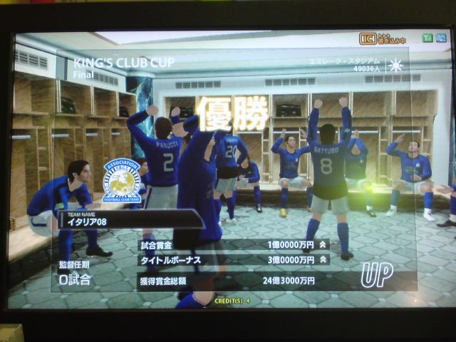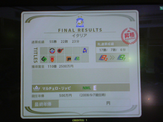 キングスクラブカップ・ナショナルスーパーカップ優勝!立ち上げ当初は1勝2敗7分けと最悪のスタートを切ったチームだったが、この日のイタリア2008は見違えるほどのプレーをして見せた。特に素晴らしかったのがモンテッラ。何気なくスタメンで起用したらいきなりハットトリック、次の試合でも2得点とヴィエリ・インザーギよりも得点力が上だった。今回2つのタイトルを獲得できたのはモンテッラのお陰である。なぜもっと早く使ってみなかったのかと後悔した。 獲得タイトル