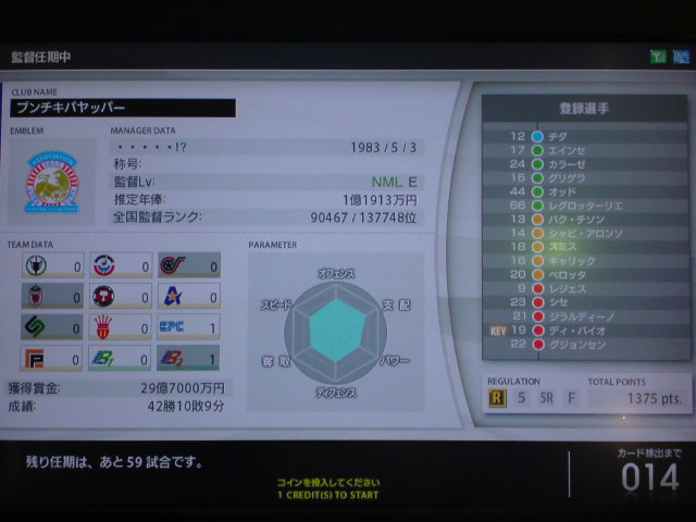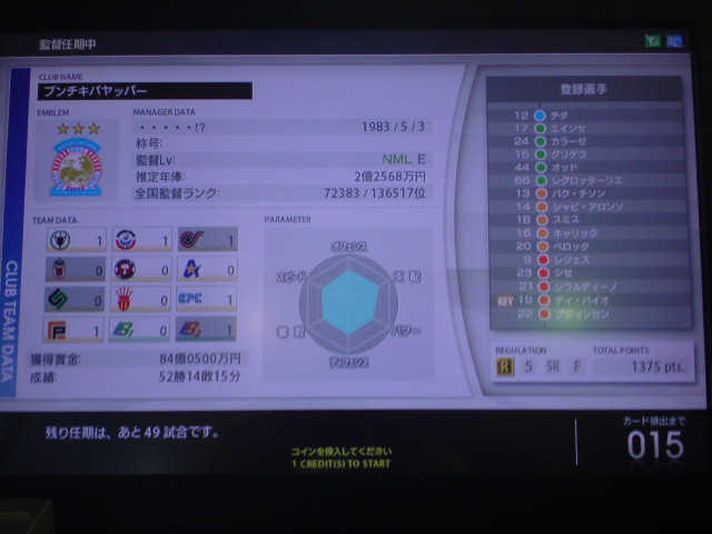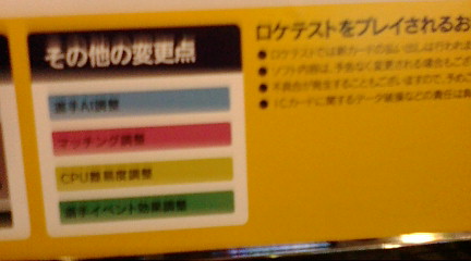 ※WCCF07-08の情報は猫風呂具さんの許可を頂いて記事を転載させていただいてます。 特筆すべき事は無いので今日の新しい発見を少々。 ちなみに夕方以降は夜の9時ごろに8人待ちになったのが最高で基本的には4~5人待ちでした。 ◎異常にスタミナの減りが早い原因 4日目まで気が付きませんでしたが、ハーフタイムで選手のスタミナが回復しません。 これと試合時間が長くなった事で選手のスタミナが空っぽになる事が増えました。 試合開始前のレベルに戻す必要は無いと思いますが06-07程度の回復量は欲しいと思います。 何故変更したんでしょうか? あと前半で交代してベンチに居る選手のスタミナが無いとハーフタイムコメントが出ました。 修正しておいた方が良いかと。 ◎対戦申し込み フレンドリーマッチの時に監督室から選べる対戦申し込みを選んだ際のコメントに、店内の他のプレイヤーかネットワーク上の対戦相手に申し込む(正確な文章は覚えて無いです)みたいなコメントが出ていた事に今日になって気が付きました。 1年以上前に06-07が発表された際のネットワーク対戦は、フレンドリーマッチを利用するような事が書いてあった気がするので、最初の予定に戻ったという事でしょうか? 結果としてレギュラーリーグでの全国対戦は無くなったと考えて良いのかな? なのでスケジュールが電源立ち上げ→プレシーズン前のRL固定では無くなったんでしょうか? ◎マッチング調整 どうやら05-06方式に近くなったのではないかと言う話が後輩から出て来たので、確認しながらやってたら何度かハズレました。4サテの場合とICCが無い場合を考えると全く同じにはならないでしょうけどヒントは有りそうです。 今の所は同じ人と何度もレギュラーリーグで対戦する事は無くなりました。 なのでカップ戦の決勝とレギュラーリーグで連戦になったら7分の1のハズレクジを引いたと言う事になりますね。 後は特に無し。 ロケテの操作に慣れると今の06-07が別のゲームに感じるようになって勝てなくなりますので ロケテのやりすぎには気をつけましょう。 以下希望的修正案(長すぎてアンケートには書けない) ◎大会モード 05-06までの大会モードはワンマッチ(PK有り無し)とトーナメント(4or8チーム)グループリーグの4種類しかなくて、細かい設定もレギュレーションの設定とポイント制の有無と任期終了カードの使用制限スケジュール設定 ぐらいしか無かった気がするんですが。 ※ワンマッチの臨席対戦以外の設定 例えばランダム対戦を導入してもらえると試合が終わる度に毎回席を移動しなくても、他の7人(1人とは対戦済みなので実質6人)のプレイヤーとワンマッチで対戦できるようになる仕様を追加して欲しい。 ワンマッチにもコンティニュー設定を追加してコンティニューした場合は、1回対戦した相手とはマッチングしない仕様にして、対戦可能なプレイヤーが居ない場合(他のプレイヤーとの対戦が全て終わった場合)はCPU戦になるようにしておけば、ワンマッチ(PK有り、ランダム)とかの設定で5クレ1000円で5試合対人戦が気楽に楽しめる事になる。 もちろん監督室の対戦申し込み機能で対戦相手を指定出来ればワンマッチ(PK有り、指定制)も有っても良いかも。残り60秒までに申し込まなきゃならないのでミスったらブーイングかも。 05-06が2年間稼動していたにも拘らず延命できたのはローカルと大会モードの存在が物凄く大きいと思うので 大会モードの設定は出来る限り細かくできるようにして欲しい。 ※グループリーグ勝ち抜けチーム数設定 グループリーグの2位までが勝ち上がったような演出はICCやW4に沿っていると思うのだけど、1位抜け設定を追加して欲しい。2位でも勝ち抜けたような演出は何か裏が有るような気がするので、1位抜けじゃないと意味が無いレギュレーションを追加して細かく設定できるようにして欲しい。 [WCCF]ブログ村キーワード wccf 07-08 ロケテ PR