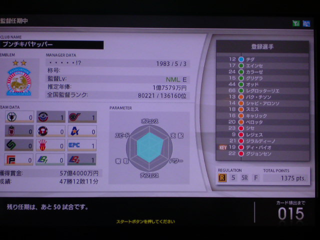 >渋谷系猫風呂具~WCCF~ ※WCCF07-08の情報は猫風呂具さんの許可を頂いて記事を転載させていただいてます。 ◎開始スケジュールの変更 今のバージョンだと電源を立ち上げた際に必ずプレシーズンマッチの前のレギュラーリーグから始まる仕様になっており、これは将来のネットワーク対戦を見据えたものだと言う事は散々書いてきましたが、今日の夜にICCが終わった後のプレ後のW4中に処理落ち(試合中にボタン操作等の入力を多くした場合に次の試合が中々始まらずに1試合分程度ランキング画面のままでカウントダウンが始まらない状態)が頻発したので電源を落として立ち上げ直した所、エンプラ前のレギュラーリーグに進み(戻り?)ました。 その後にICCが有ったのでスケジュール上は物凄く戻った事になるのですが、05-06までは電源を落とした場合は基本的に終了したカップ戦の前のレギュラーリーグまで戻る仕様だったので、もしかしたら07-08はICC有りのカップスケジュールの中からランダムに始まるんでしょうか?謎です。 ちなみに今日はプレシーズン前or1回戦辺りで終わってますので、05-06仕様ならば明日はプレ前かICC前から始まるはず。朝から行く方はチェックしてみて下さい。 ◎マッチング調整(ポップに明記して有ります) フレンドリーマッチでのCPU戦の指定が出来る事は一昨日書きましたけど、残り時間60秒までに申し込みを忘れてしまった試合でも頻繁にCPU戦になりました。 他のプレイヤーがCPU戦指定をしている可能性ももちろんあるのですが、衝撃的だったのはレギュラーリーグに7人出場していて1部が4人、2部が3人の状態で全員がCPU戦になりました。 05-06までの最大同時処理試合数は6試合だったのでICCのグループリーグやCT&ローカルの1回戦の裏で、3人以上がフレンドリーマッチをこなしていない限り対人戦にはならなかったのですが、07-08では同時に7試合の処理が可能なようです。 おそらく8試合でも可能なんでしょうけど大会モードに興味が無い人に対して「ある程度の対人戦」は 必要だと思っているでしょうから「やろうと思えばレギュラーリーグを全員対CPU戦にする事も可能」なんでしょうけどやらないでしょうね。 ◎CPU難易度調整(ポップに明記して有ります) 個人的には「現状の06-07のCPUがそれほど強いのか?」と言われると「IC3枚ぐらい更新すると05-06の頃とそんなに変わらないって思うようになるじゃないのか?」って思うんですが、06-07と比べて07-08のCPUが強いとは思わないですけど弱いとも思いません。 06-07には慣れてきていますからCPU戦だけをやっていれば勝率6割を切る事は無いでしょうし、07-08には慣れていませんからCPUが弱くなったとしても勝率6割を超えるのは中々難しいです。 結局は「チーム状態」と「対戦チームとの相性」なんじゃないかと思うんですよね。 自分がやりたい事だけやってたら相性が悪いチームにボコられるのは当然といえば当然。 でも対人戦で負けた後のCPU戦ぐらいは接待して欲しいよね、って思うのも人として当然。 ◎選手AI調整(ポップに明記して有ります) 個々の動きに関してはまだまだ分からない事が多いです。結構レギュレーションフリーなチームとの対戦が多いのですが立ち上げ15試合目のU-5のチームでレギュラー1部に出たら対人戦でボコられました、勝敗には関係無かったけどロンシューもされました。 試合中に勝利精神が下がることの悪影響は相変わらず皆無でしょうか? 昨日はサイドのドリブルが凶悪だったけど今日は中央の突破と斜めスルーが凶悪でした。 適当ミドルは相変わらず決定力が無くなっています、良い事だ。 ディフェンダーのルーズボールやロンシューへの反応が特に良かったのですが、マルディーニ+バレージ+ネスタ+コスタクルタだから良かっただけかもしれません。 自分も含めて5Rやフリーのチームが多いのですが所謂「戦力差補正」見たいな物は余り感じませんでした。多分気のせいです。弱いチームや下手な人でも3回に1回は勝てるのがWCCFのはずです。 良くも悪くもそれがWCCFです。 ◎選手イベント効果調整(ポップに明記して有ります) 今の所カップ戦勝利時の任期延長ぐらいかな?あと個人能力呼び出しのときに今のバージョンだと勝った試合(特に無失点)の後のディフェンダーに対しては、ディフェンスを褒めてれば喜んだんですけど07-08だと今の所は成功した事が無いです。その代わりに負けた試合の後に悪い点としてディフェンスを選ぶと成功率100%です。この辺も微調整入ってるんでしょうか? あと後輩がレギュラーリーグで優勝したらミーティングルームかメディカルルームか「監督室のどれを改造しますか?」と言うようなイベントが発生したらしくて、ミーティングルームを選んだら豪華な2階建てになったそうです。カップ戦優勝時にも何か有りそうです。 ネタに使ってくれと画像を送ってくれました。 情報提供者:書かない方が良いよね? [WCCF]ブログ村キーワード wccf 07-08 ロケテ [PR]豪華引越!極引越