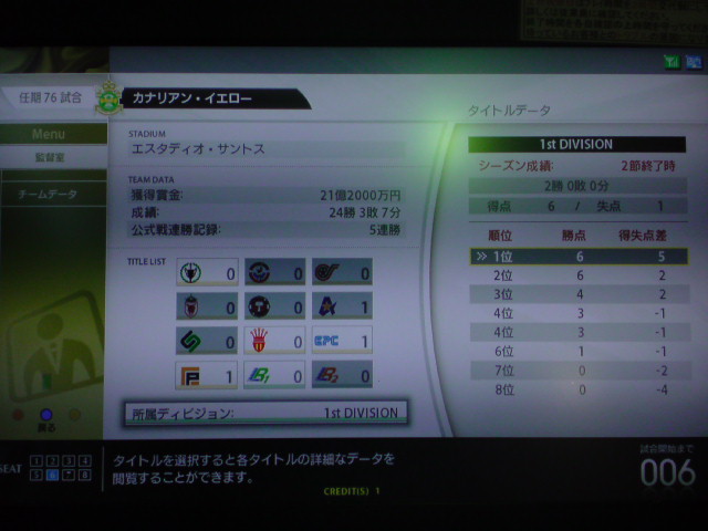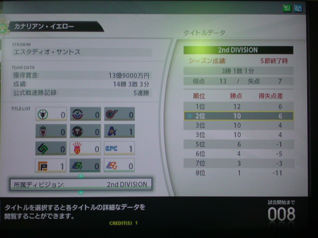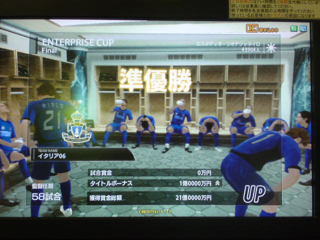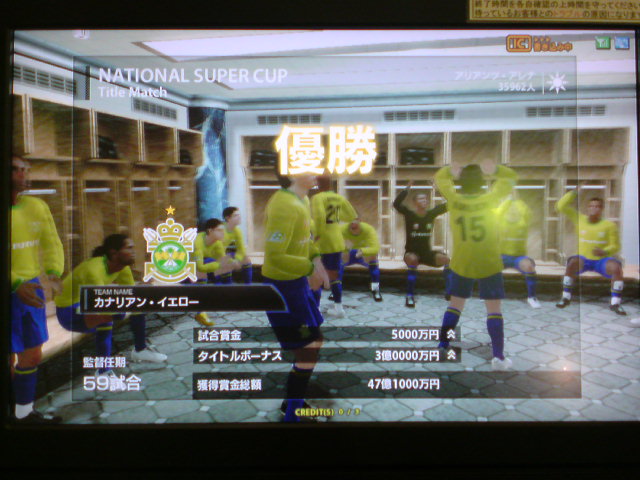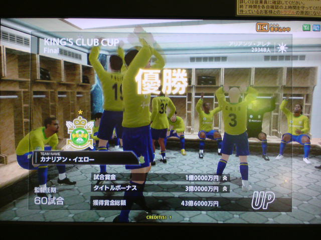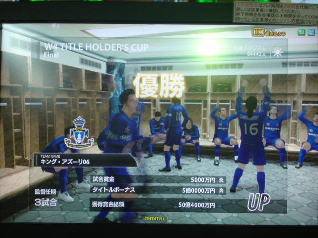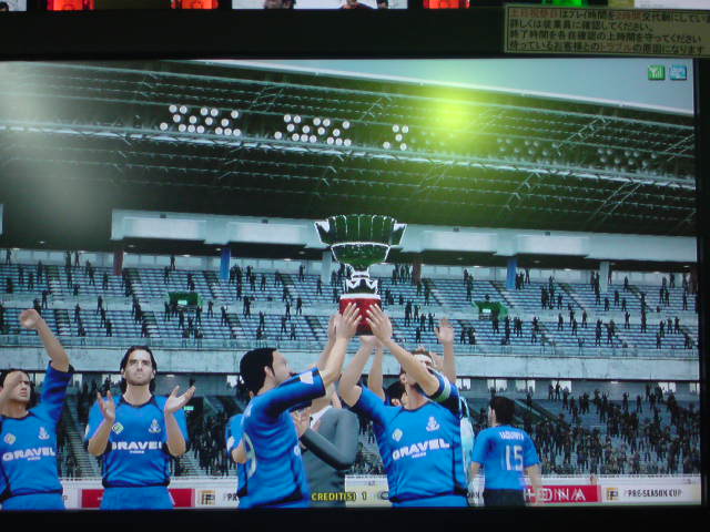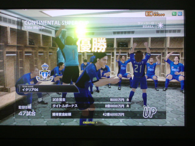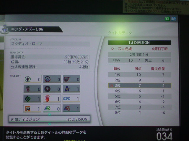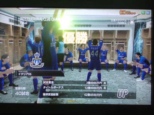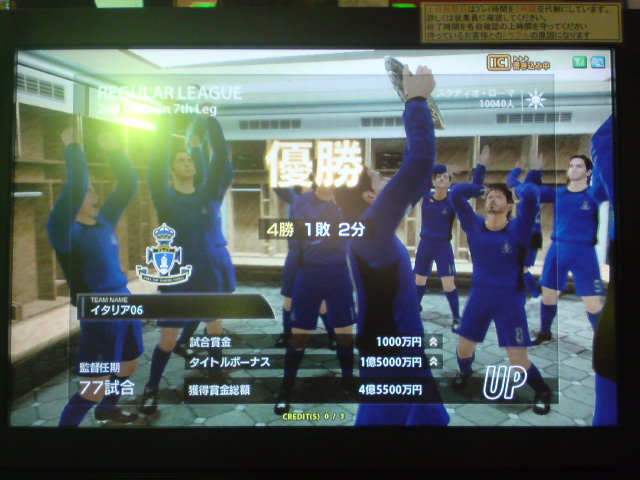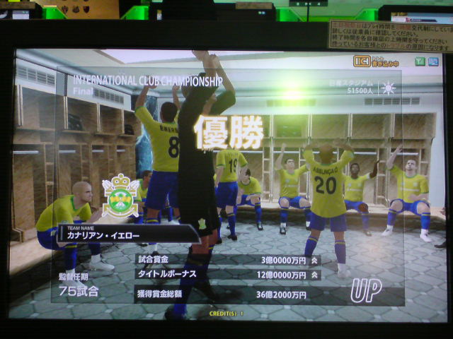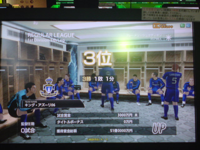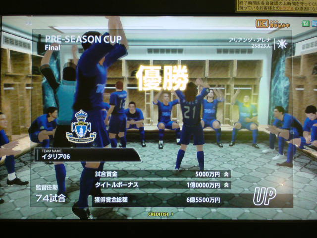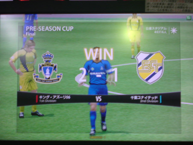 インターナショナルクラブチャンピオンシップ初優勝! 決勝戦、先制するも後半終了間際に同点に追いつかれ、そのままPK戦へ。 決勝前に01-02白ジダから04-05黒ジダ(スキル:PKストッパー)に 変更したのが吉に出て、PK2本止めて優勝。 ICC前にレギュラーリーグD2、2位でD1昇格。 4勝1敗2分けで2位・・・1位とは勝ち点4点差もついてた。 レギュラーリーグD1、第3節終了で2勝1敗0分けで3位