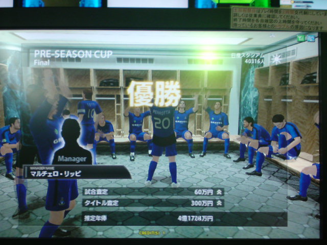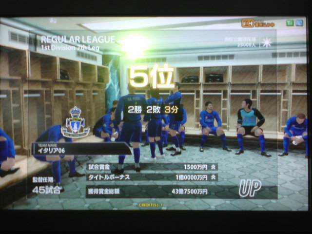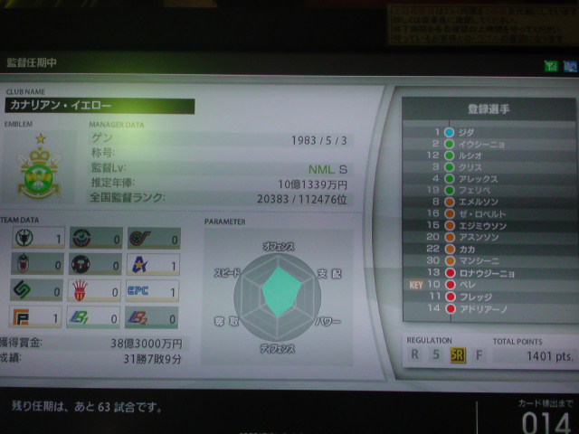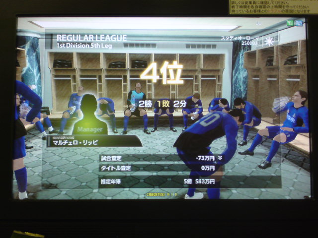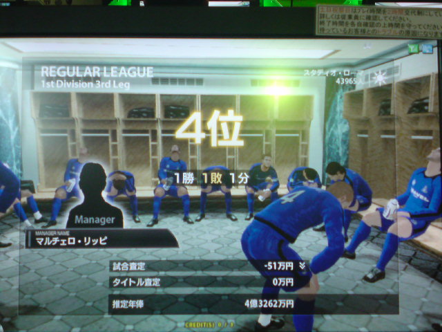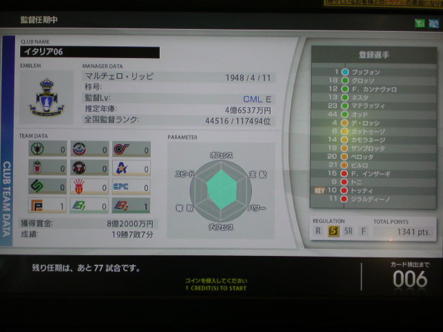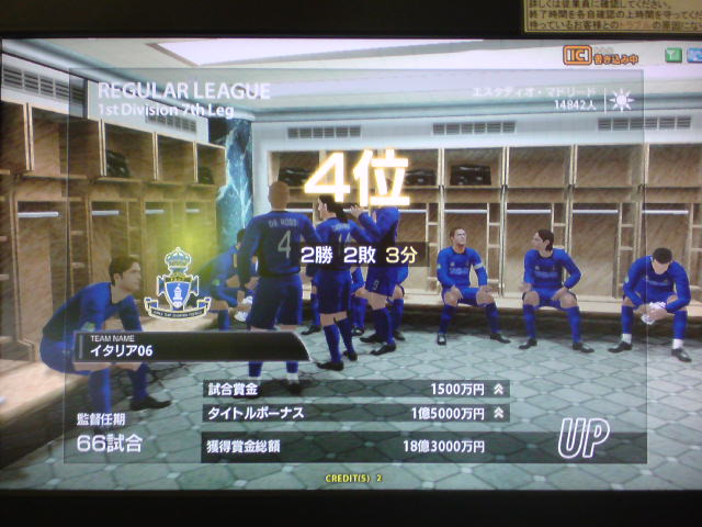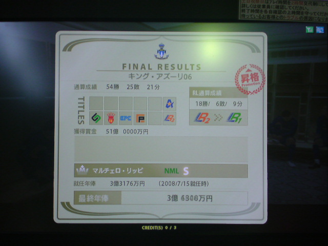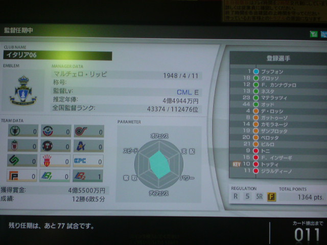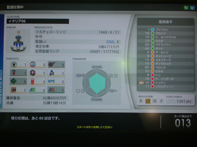 プレシーズンカップ決勝、対千葉ユナイテッド戦1点差で勝利。 W4タイトルホルダーズカップ決勝、対アヤックス戦。 前半1点先制されるも、後半2点取って逆転優勝。 レギュラーリーグD1、第5節勝利。3勝1敗1分で任期終了。 獲得賞金額:51億0000万円 成績:54勝 25敗 21分 獲得タイトル:6個 師弟関係:トッティ個★5特★5CP・CK・PK、トニ個★4特★4 他にも、ジラルディーノ個★5特★4、ブッフォン個★4特★4だったが、 ジラルディーノではなくトニが師弟関係に選ばれた。 獲得タイトル
